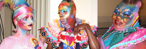 The afternoon kicked off with a tea party complete with fine china and colourful cupcakes. The show began in an impromptu hallway with every colour of the spectrum perfectly complimented with make-up by Alex Box. Her execution of colour demonstrated her fine art background and this show saw models scantily-clad but with emphasis on their bodies as a canvas for maximum colour and intricate designs. Even the crowd at this show was different to the usual LFW throng, who were just as colourfully and eccentrically dressed as Johnny Blue Eye’s own ‘Angels’.