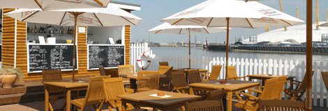 Approaching The Gun, its Docklands location and initial outside appearance is surprisingly deceptive. Set amid what appears to be a dismal-looking housing estate, industrial area and building site, the interior of The Gun is tastefully decorated and true to its namesake with plenty of antique firearms on display. Today, however, its outside, is what’s important and entering through a side gate, we’re met by a fantastic waterfront view of the Millennium Dome.