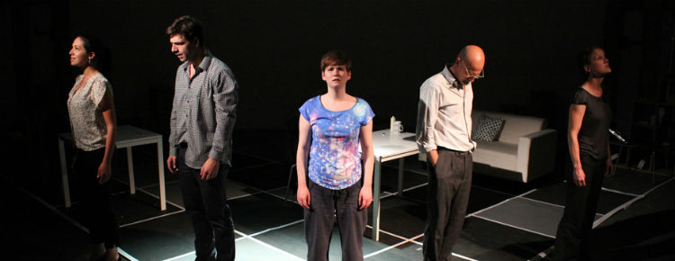 The scenes are interwoven by an exceptional script, the lines of one character seamlessly flow into others and Russell’s intelligent choreography makes for a powerful complimentary narrative, aided by some very complex and reflective lighting design and music. The characters like Conway’s cells combine to form intricate patterns both physically and emotionally whilst moving between the squares of the set.